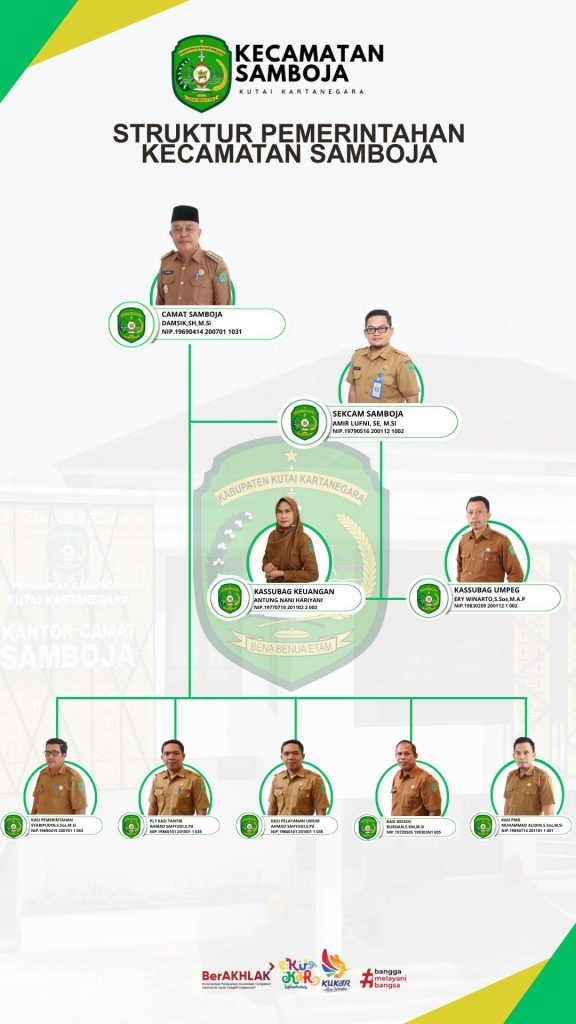 Berdasarkan peraturan Bupati Kutai Kartanegara Nomor 69 Tahun 2016, struktur organisasi Kecamatan Samboja adalah sebagai berikut :